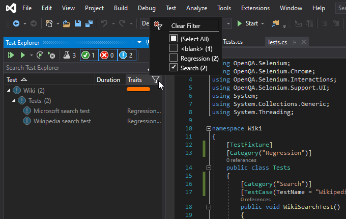 [Category(“Regression”)] – этот атрибут можно добавлять как отдельному тесту так и всему набору сразу (если мы знаем, что они относятся к одной категории). Также мы можем присваивать несколько категорий. И было бы хорошо, если бы названия категорий у нас хранились в отдельном классе, поскольку в случае изменения имени категории, мы должны будем изменять ее во всех тестах.