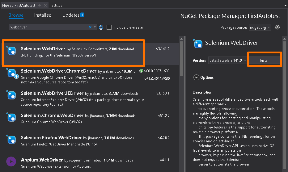 В NuGet Packages выберите ‘Browse’ -> Введите в поиске ‘Selenium.WebDriver’ -> Выберите в результатах ‘Selenium.WebDriver’ -> и нажмите кнопку ‘Install’. Также нам нужно установить библиотеку для работы с нужным нам браузером. Для начала таким же образом установим ‘Selenium.WebDriver.ChromeDriver’. Важно, чтобы версия драйвера совпадала с установленной версией браузера на вашем компьютере.