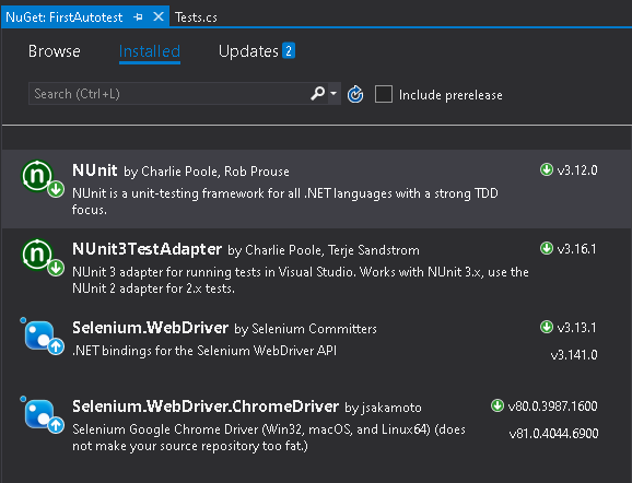 Дальше нам необходимо добавить в наш проект WebDriver и тестовый фреймворк NUnit, который позволяет нам запускать наши тесты, добавлять проверки, чтобы сравнивать актуальное и ожидаемое значение на наших страницах и много чего другого. Для этого в среде Visual Studio встроен отличный инструмент NuGet, который позволяет из удаленного хранилища скачивать и устанавливать сторонние решения в виде программных библиотек.