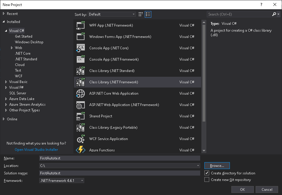 Выберите язык Visual C# и тип проекта Class Library (.NET Framework). Разницу этого типа проекта с .NET Standard пока опустим.