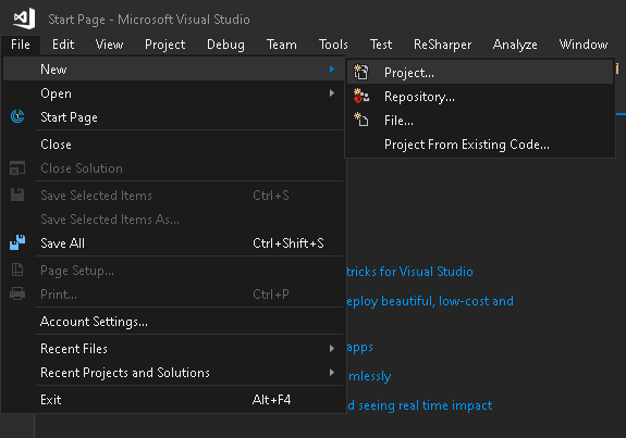 Откройте Visual Studio -> Выберите меню: File -> New -> Project