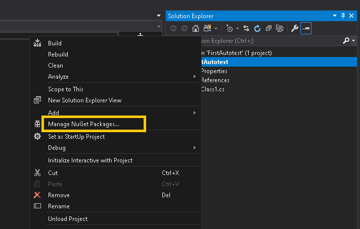 Нажмите правой кнопкой мыши на проект и выберите меню ‘Manage NuGet Packages’