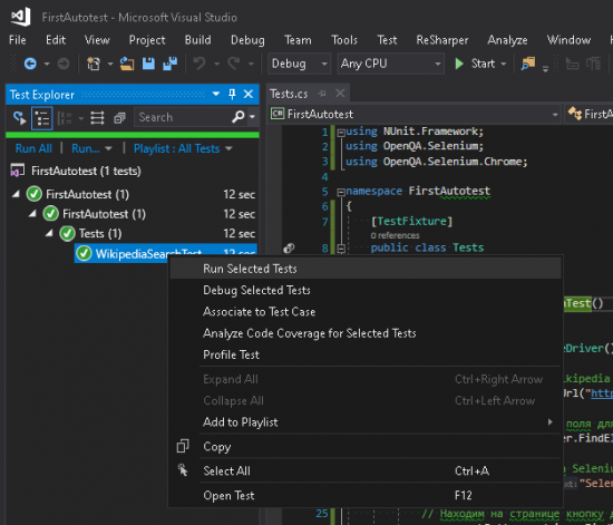 Находим наш тест, нажимаем на него правой клавишей мыши и выбираем ‘Run Selected Tests’